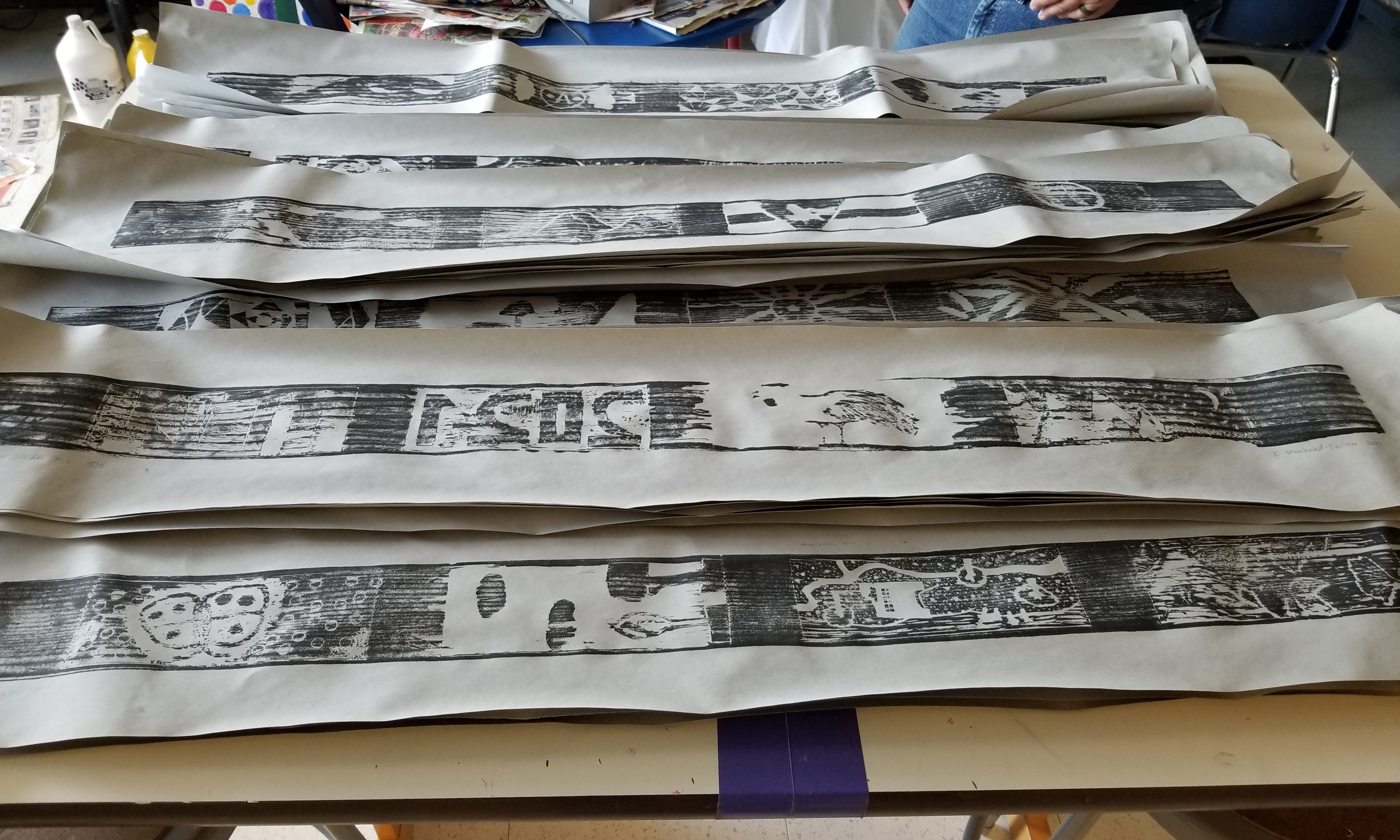 Chicago artist and Springer School and Center alumna Emily Moorhead-Wallace spent two weeks with students teaching them how to make wood cut prints and also using the original carved wood to create an outdoor bench for the on-campus student garden. All students learned with Emily during their art classes and a smaller group of eight-graders worked on the collaborative outdoor sculpture bench. Both the prints on paper and the bench are part of Springer’s permanent art collection.