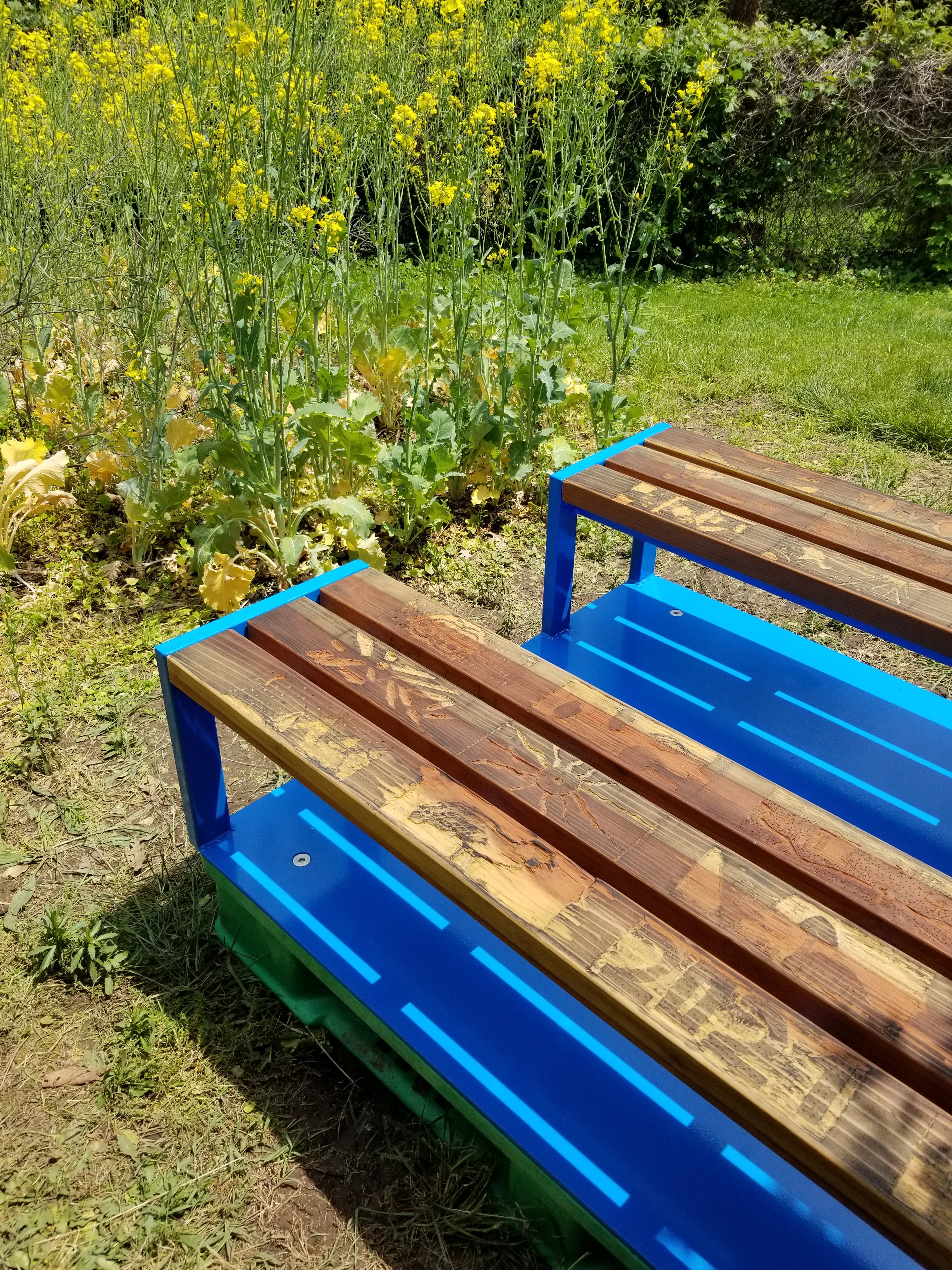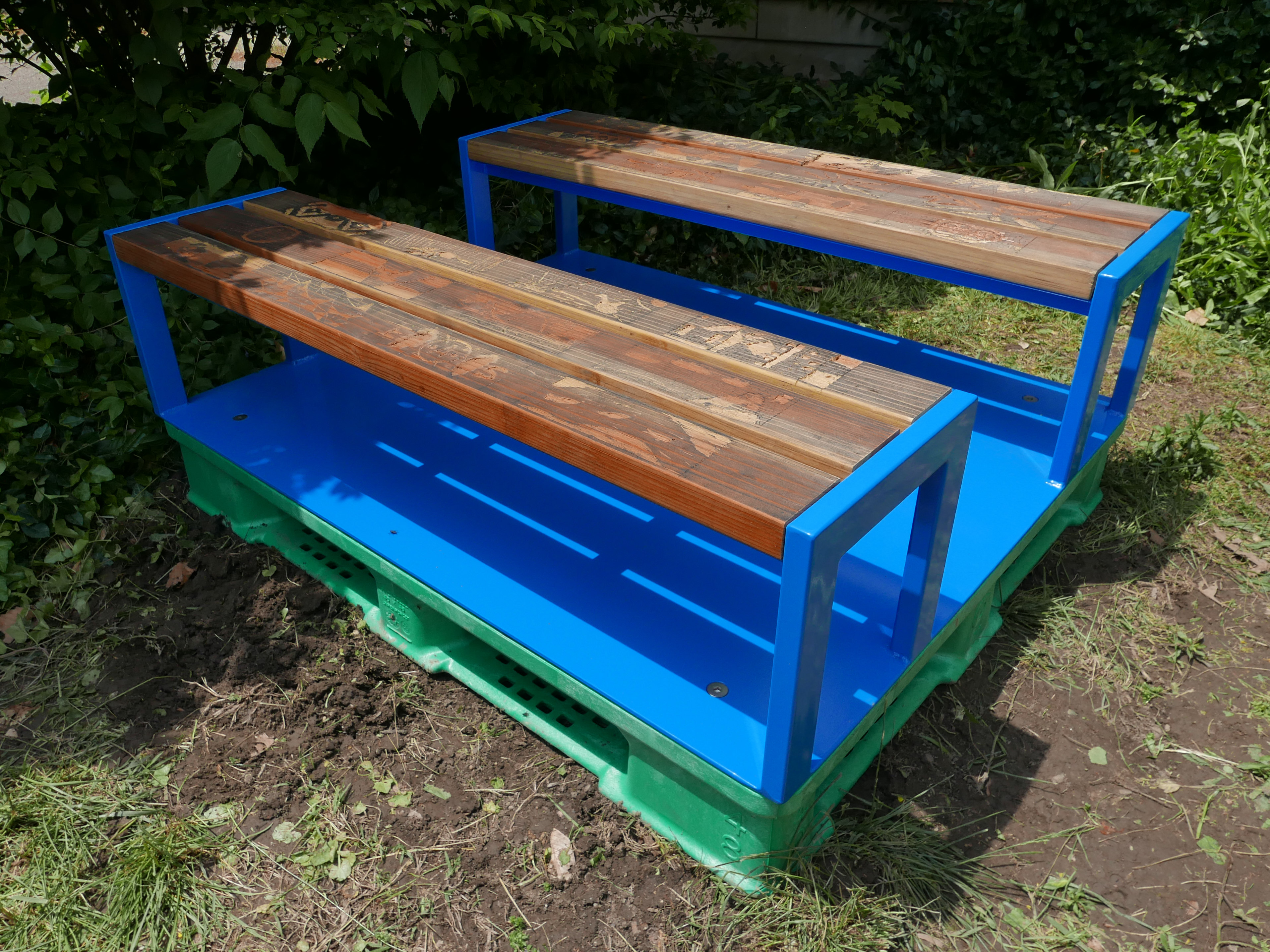 Garden Respite, 2021, Springer School & Center education garden, Cincinnati, OH, mobile steel bench with carved redwood, 18”x48”x40”