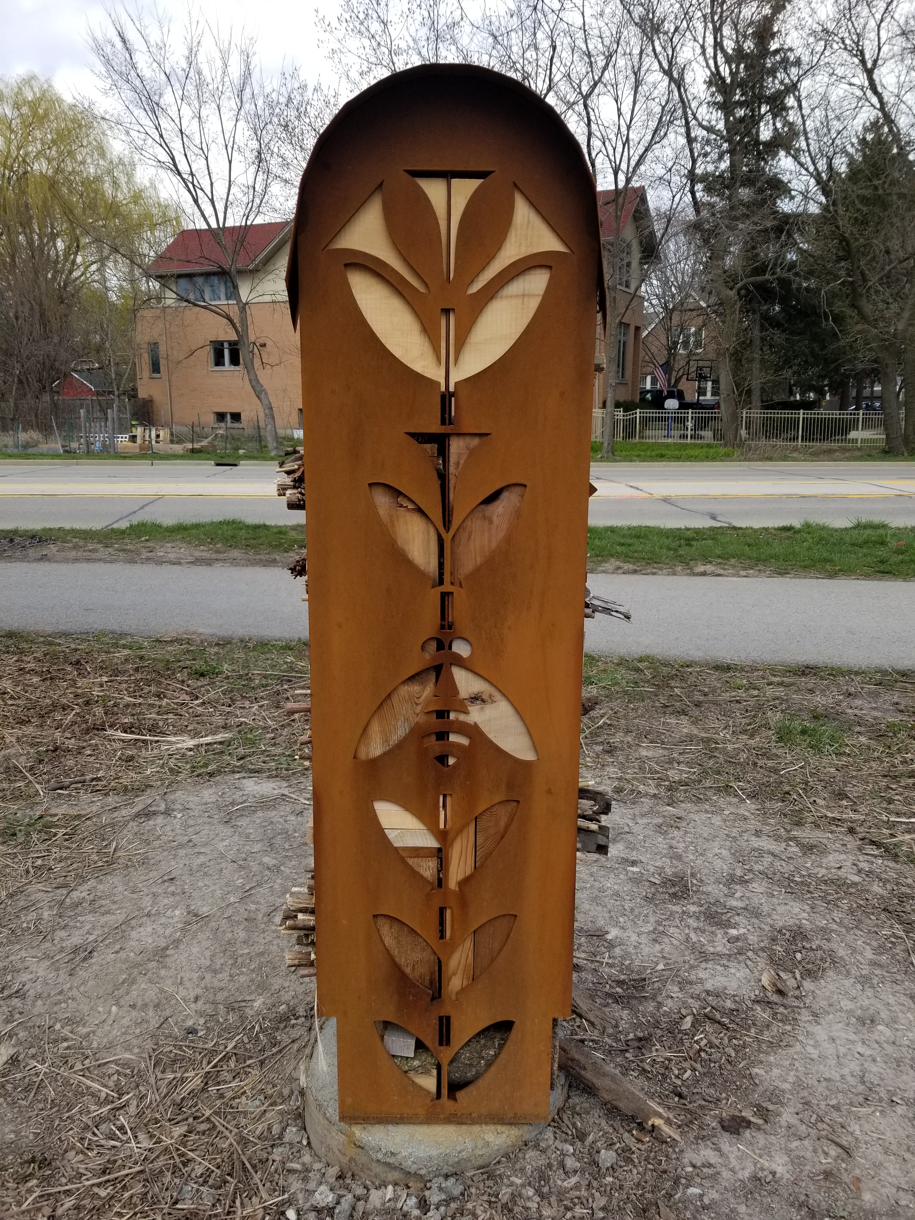 With support from the Evanston Arts Council, Chicago Sculpture International, and Horigan Urban Forest Products, artists Janet Austin and Emily Moorhead-Wallace, have created a pollinator habitat sculpture Meg Chilidae, Prairie Sanctuary for the Evanston Ecology Center. The main purpose of this project is to create an interactive sculpture that functions as a pollinator habitat and artwork thereby joining art and science. Named after the genus species, megachilidae, of the native pollinator Leafcutting Bee, the artwork is intended to meet the optimal dwelling needs of indigenous pollinators, solitary bees, and other insects. Members of the Evanston community assisted in the creation of the habitats through programming at The Evanston Ecology Center. The main structure of the sculpture is fabricated in steel with wooden boxes for these habitat cells. Through the creation and maintenance of these pollinator habitat cells, community members will become educated on the proper needs of pollinator insects.