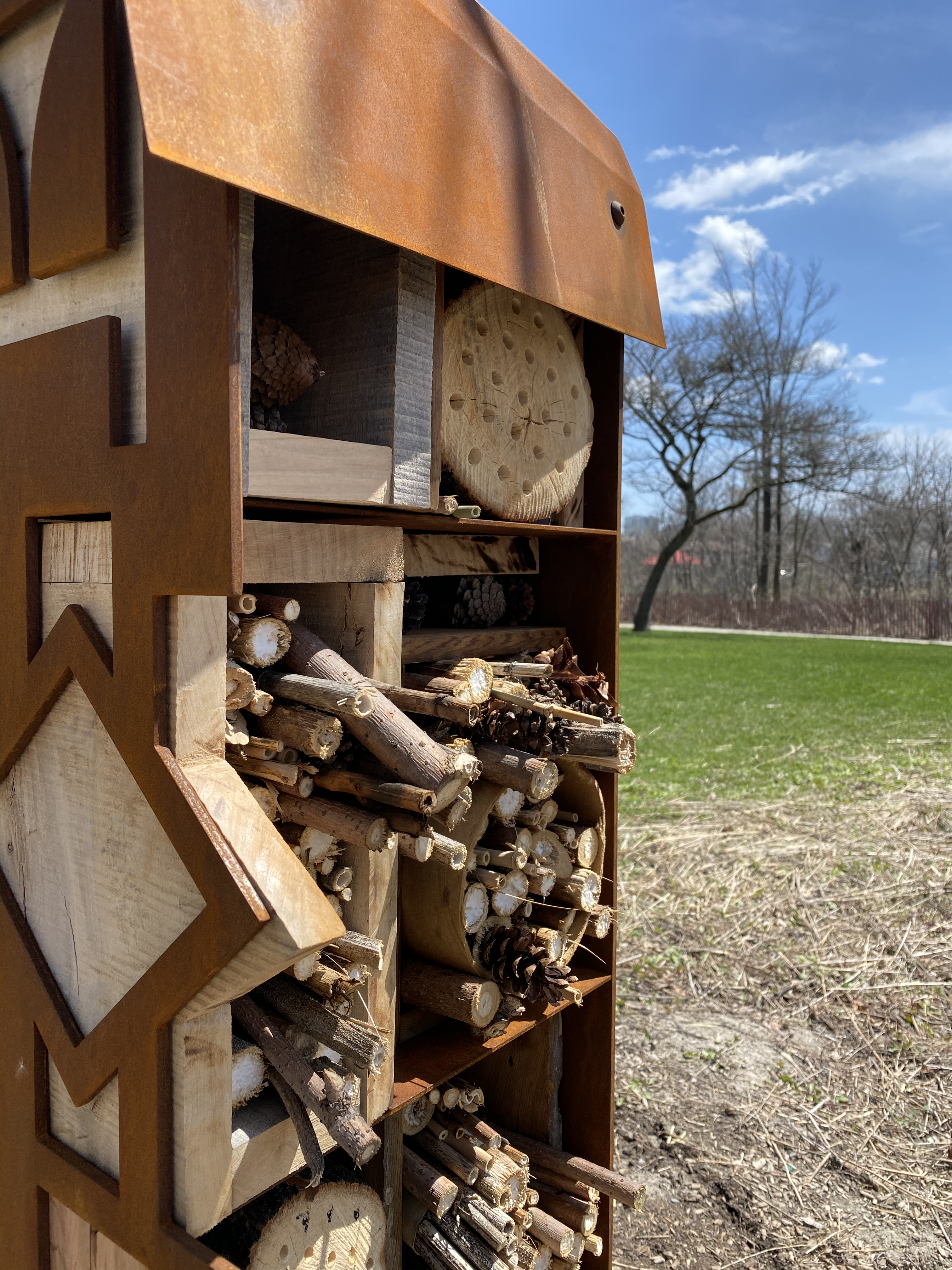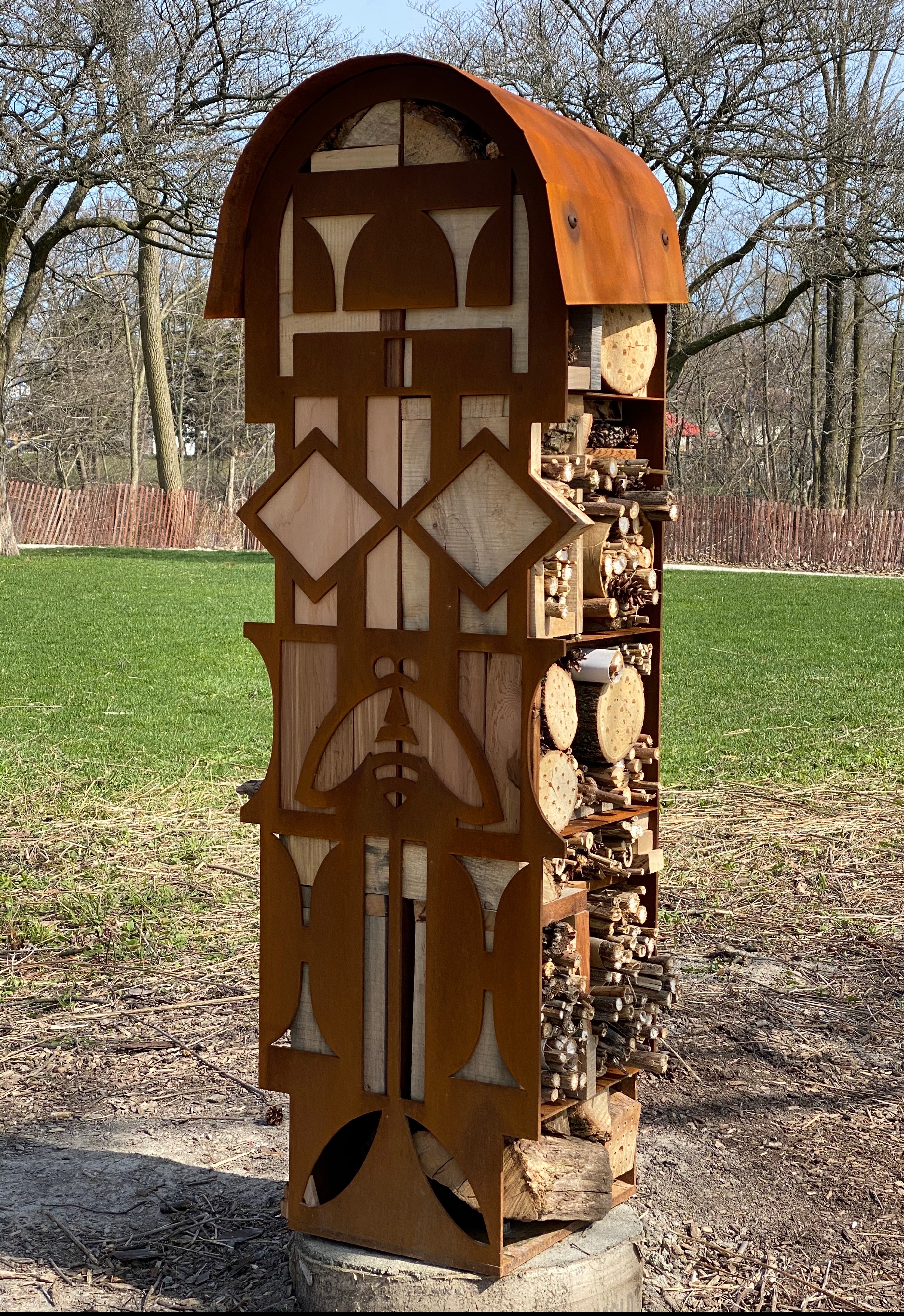 Meg Chilidae, Prairie Sanctuary, Evanston Ecology Center, Ladd Arboretum, Evanston, IL, 2020, Corten Steel with natural material nesting boxes, 6’x2’x1.5’