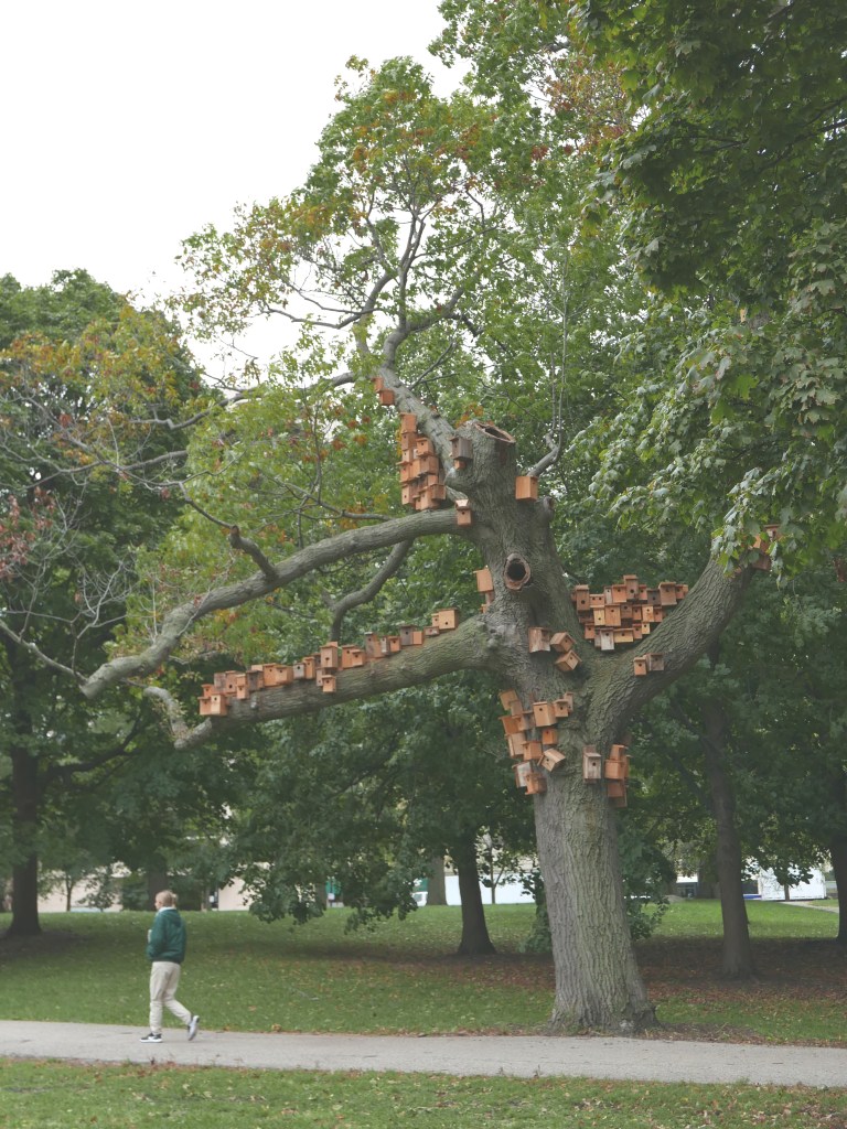 Located on the vibrant urban lakeshore and similar to the buildings surrounding it, this artwork supports high density living. To support the tree’s changing state, we have increased habitats for native bird and insect species. Houses are made of reclaimed and repurposed lumber with the ideal dimensions for various birds including chickadees, nuthatches, swallows, wrens, woodpeckers, warblers, flickers, starlings, sparrows, flycatchers, bluebirds, and titmice.