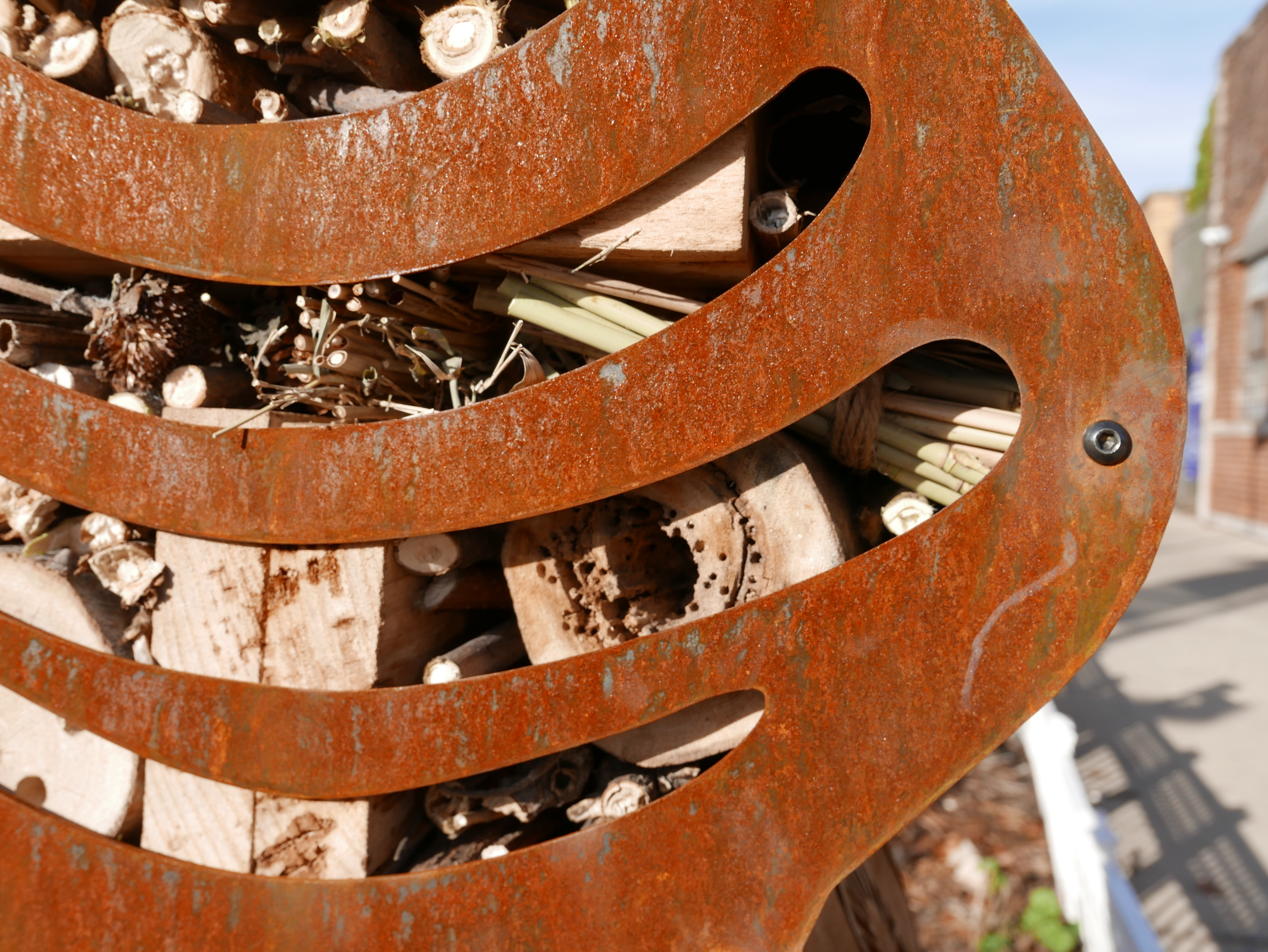 This sculpture consists of a Corten steel tree that encapsulates nesting cavities which are filled with non-treated woods, dried plants, and other eco-friendly materials. The main purpose of this project is to create an interactive sculpture that functions as a pollinator habitat and artwork thereby joining art and science. The artwork is intended to meet the optimal dwelling needs of indigenous pollinators, solitary bees, and other insects.