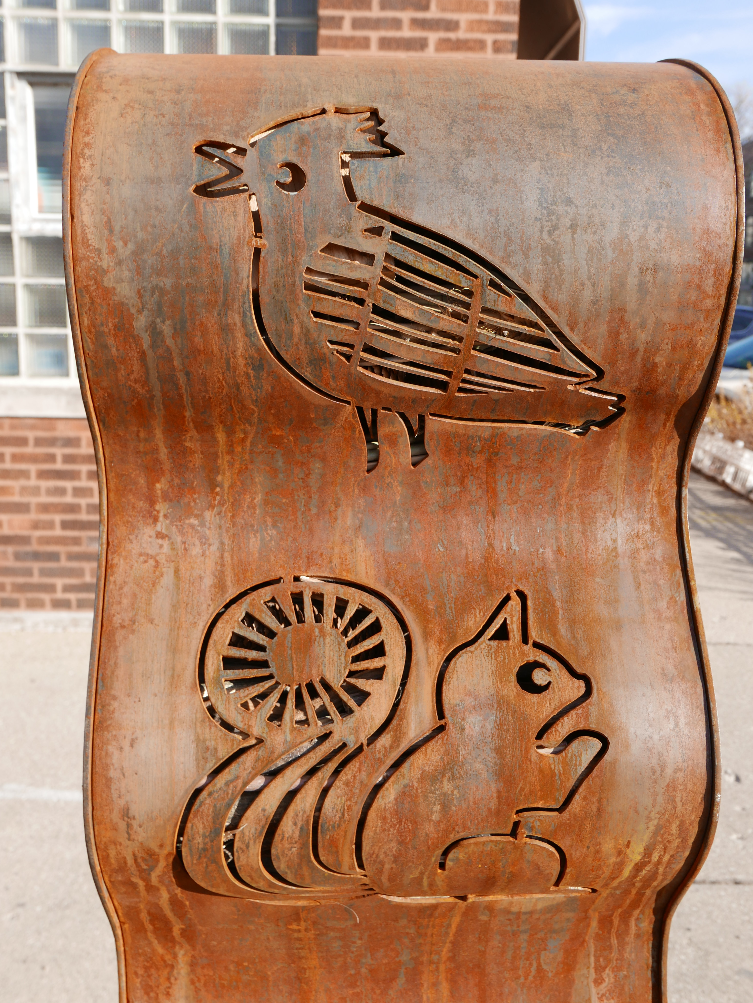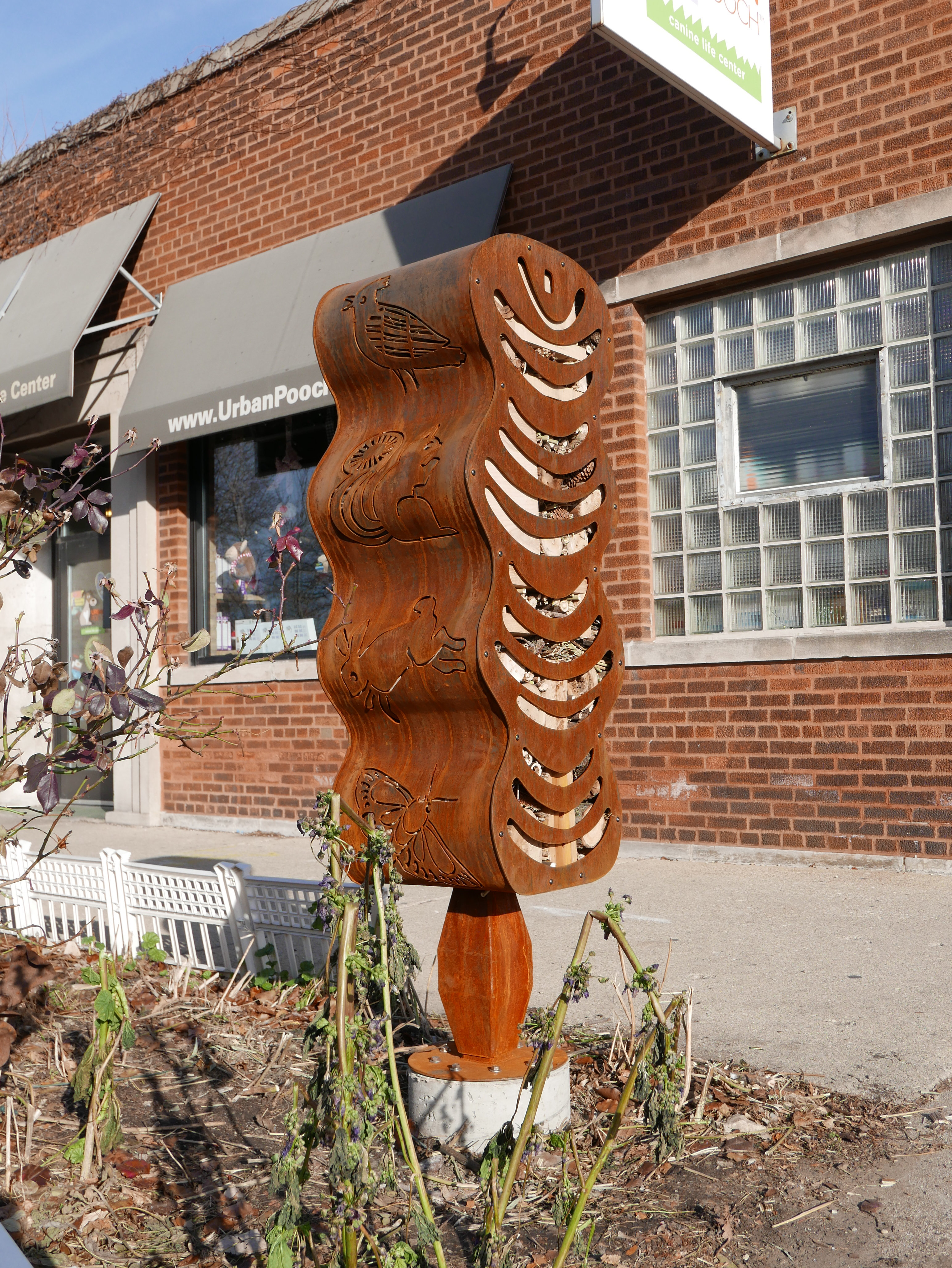 Pino: Habitat Tree, 2021, collaboration with Janet Austin, Greater Ravenswood Chamber of Commerce/Special Service Area #31 Purchase, Chicago, IL, Corten steel with wood and natural materials, 60″x 20″x15″